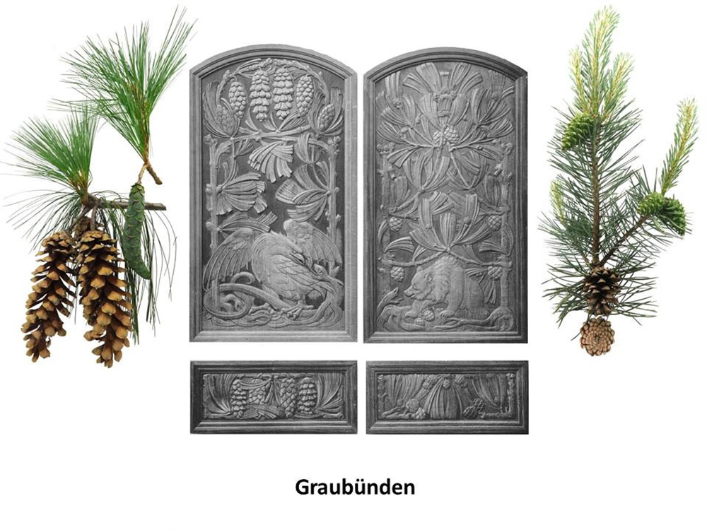 Auf dem linken Ständeratssitz sehen wir eine Tränenkiefer, an deren Fuss eine sich windende Schlange (Kreuzotter?) vom Steinadler gepackt wird. Den rechten Sitz ziert eine nicht identifizierbare Föhren-Art, eventuell die Gemeine oder eine Bergföhre mit sehr kleinen Zapfen im Vergleich zur Nadellänge. An deren Grund faucht in der linken unteren Ecke eine Schlange einen schönen Braunbären an.