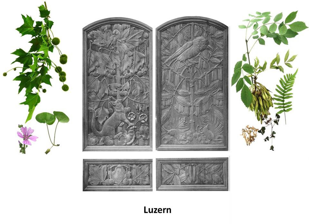 Die Luzerner Ständeratssitz werden von der Ahornblättrigen Platane, einem Platanengewächs, und der Gemeinen Esche, einem Ölbaumgewächs, geschmückt. Im Geäst der Platane offeriert ein Singvogel seiner Angebeteten einen Wurm, scharf beobachtet von eine am Boden lauernden Hauskatze. Von einem Zweig der Esche aus beäugt ein Kolkrabe die Kleinsäuger, die sich unter ihm am Boden tummeln.