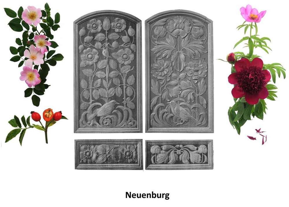 Des merles sous une rose musquée ou églantine, pour l’un, une rose canine et un plant de pivoine de culture: les ornements floraux des sièges des conseillers aux Etats neuchâtelois parfument haies et jardins.