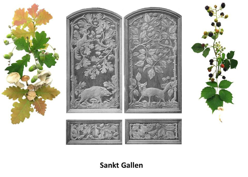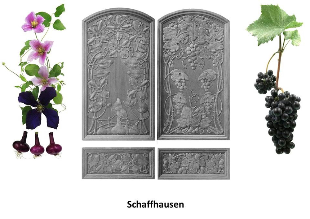 Den einen Sitz der Schaffhauser Ständeräte ziert eine grossblütige Clematis-Sorte, eine um 1900 sehr beliebte, aus Ostasien stammende Zierpflanze, nebst einer Gruppe von fünf Speisezwiebeln, den anderen ein prachtvoller, mit Trauben reich behangener Rebstock.
