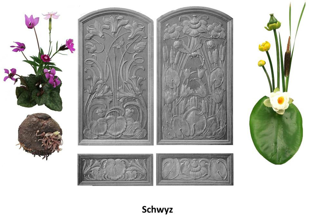 Dem Kanton Schwyz hat Huttenlocher einerseits ein Alpenveilchen, zusammen mit einer stark stilisierten Nelke zugeordnet, andererseits Wasser- und Sumpfpflanzen, die damals und heute im Kanton zu finden sind: die Teichrose, die Seerose und der Breitblätterige Rohrkolben. Eine Libelle schwebt über den Wasserpflanzen.