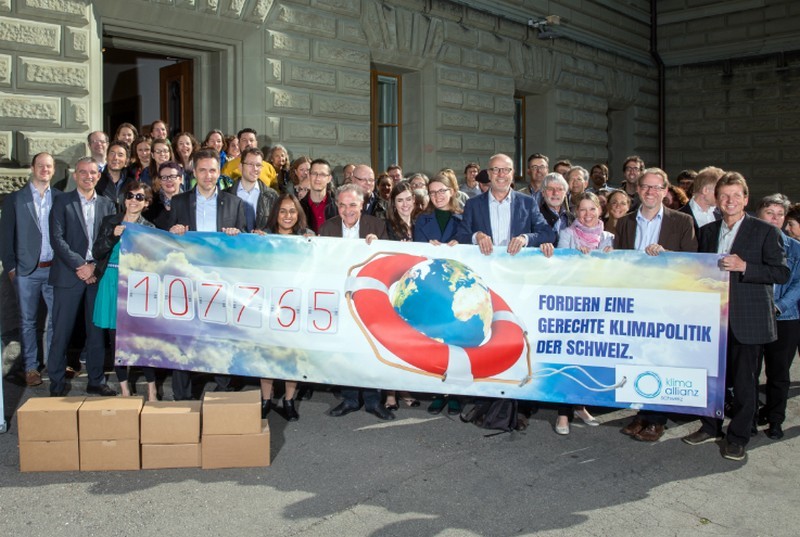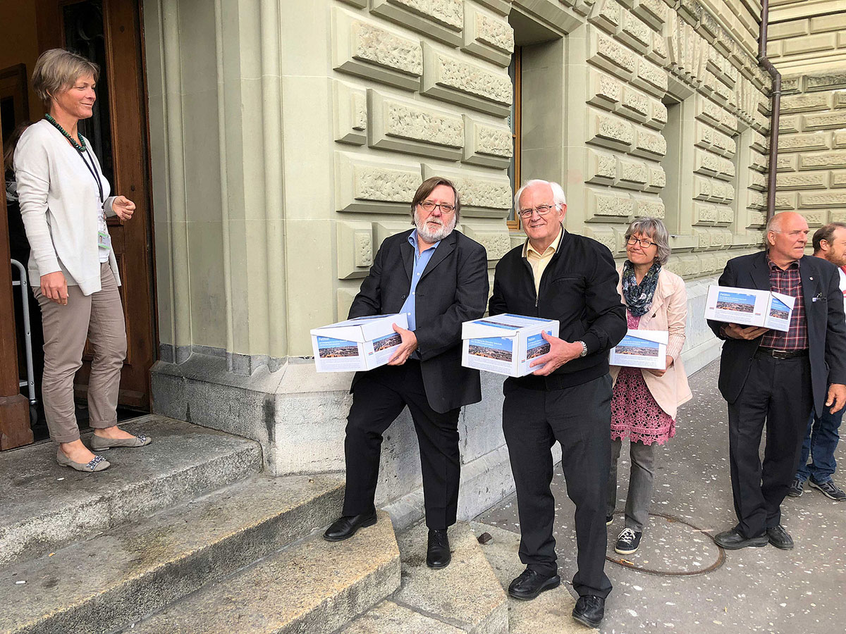 Remise de pétitions au Palais fédéral (ici : pétition 18.2013 : Transfert de l’ambassade suisse de Tel Aviv à Jérusalem, © EDU Schweiz - et pétition 15.2012 : Pour une politique climatique équitable, avec les cartons de signatures au premier plan, © Marco Zanoni/Klimaallianz Schweiz.)