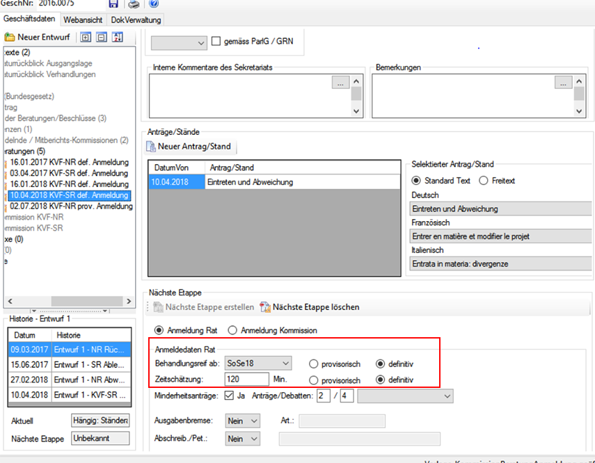 Annonce par le secrétariat de la Commission des transports et télécommunication du Conseil des Etats (CTT-E/KVF-SR) d’un objet dans la banque de données. Dans l’encart rouge: la session pour laquelle l’objet sera prêt (SoSe18 = session d’été 2018) et l’estimation du temps que prendra son traitement (120 minutes).