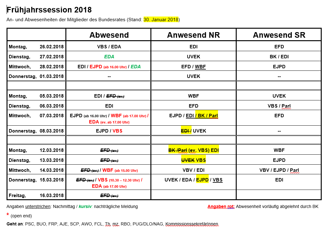 Liste de présence des conseillers fédéraux pour la session de printemps.