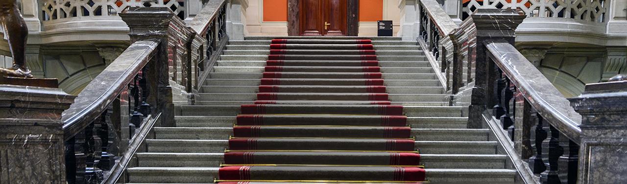 Für die feierliche Ausgestaltung der Haupttreppe wählte Auer Aaregranit von Wassen. Granite sind magmatische Gesteine, deren Entstehung auf die Erstarrung schmelzflüssiger Magmen zurückgeht. Der zentrale Aaregranit des Aarmassivs zeichnet sich durch eine helle Körnung aus.
