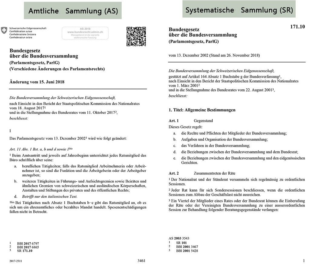 Die Bundesgesetze werden sowohl in der chronologisch (d. h. nach dem Zeitpunkt des Inkrafttretens) gegliederten Amtlichen Sammlung (AS), als auch in der nach Sachgebieten geordneten Systematischen Rechtssammlung (SR) publiziert. In der Amtlichen Sammlung werden jeweils nur die revidierten Teile eines bereits existierenden