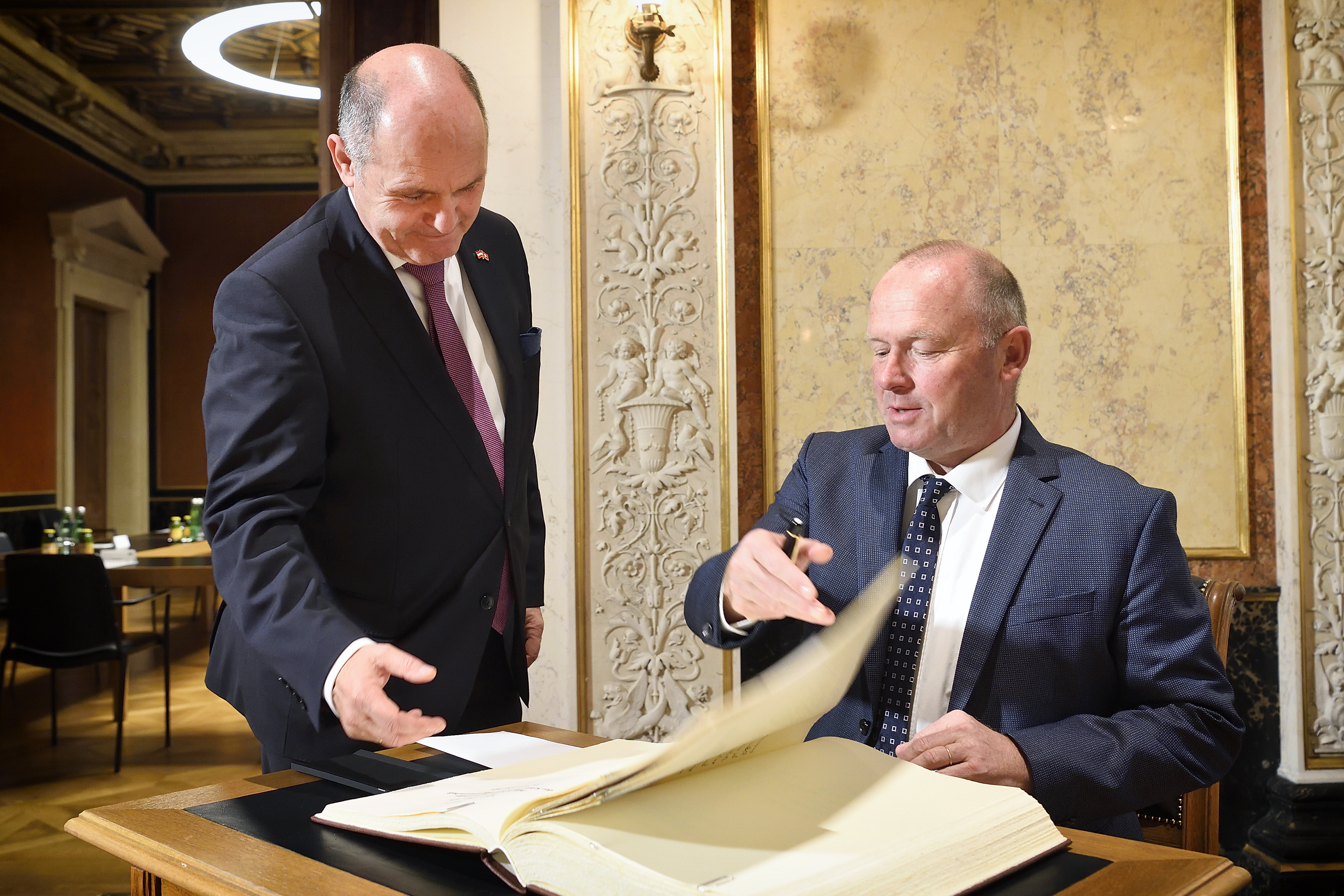 Signature du livre d’or avec le président du Conseil national autrichien, Wolfgang Sobotka (à gauche)